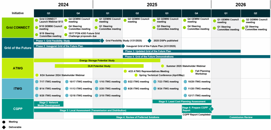 The calendar below provides a timeline for key activities related to the development of New York’s power grid. The calendar tracks the activities, meetings, and milestones of Grid CONNECT, the Grid of the Future, the ATWG, the ITWG, and the CGPP.